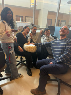![]() Jiaqi, Jessica, Ana, Karla, and Karol after a full day of microCT imaging. A long day, lots of scans, and team bonding. | ![]() Karla, Jessica, and Karol after a big experiment. | ![]() Jiaqi showed up with enough popcorn to feed the whole lab (and possibly the whole building). Please ignore the giant popcorn bag. |